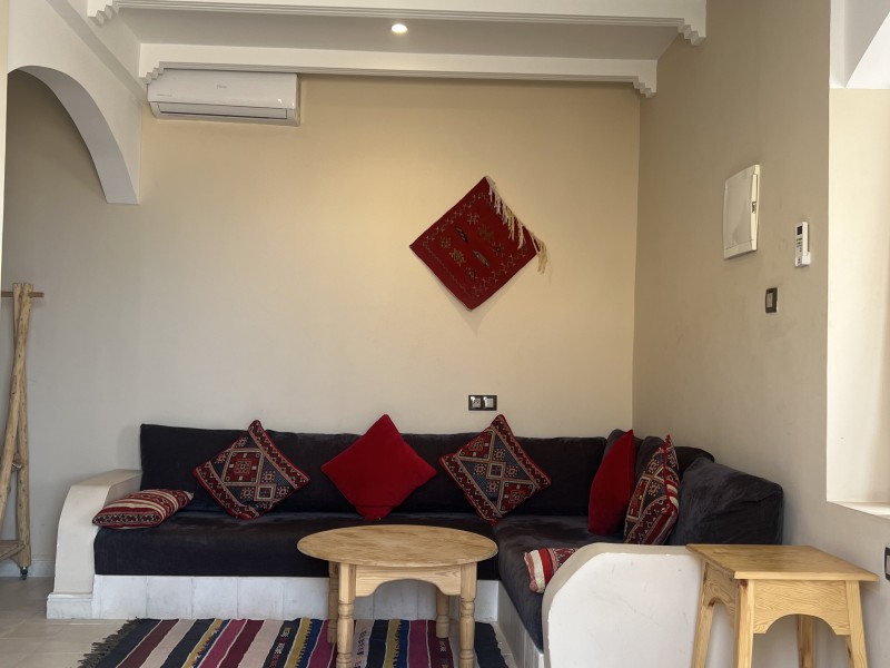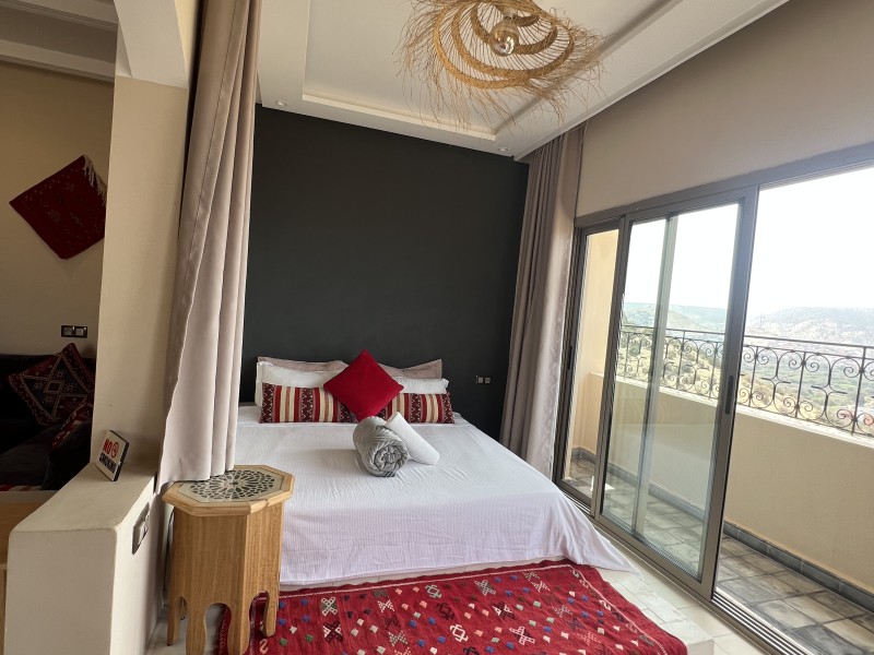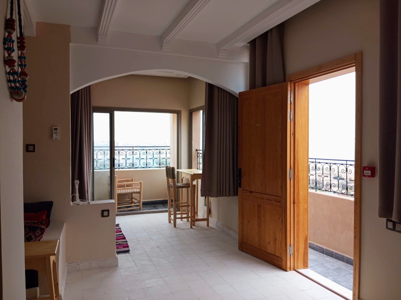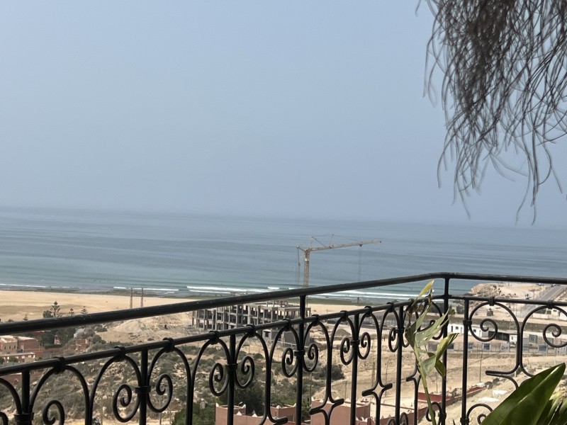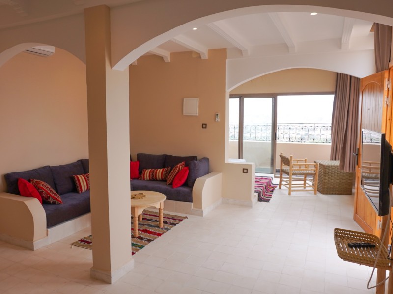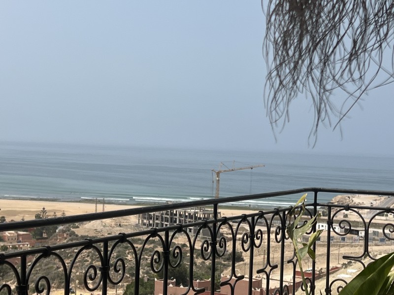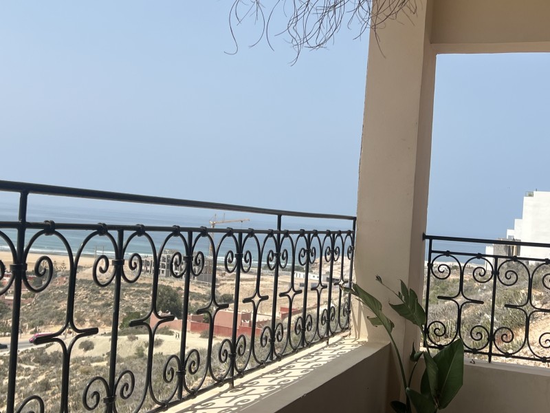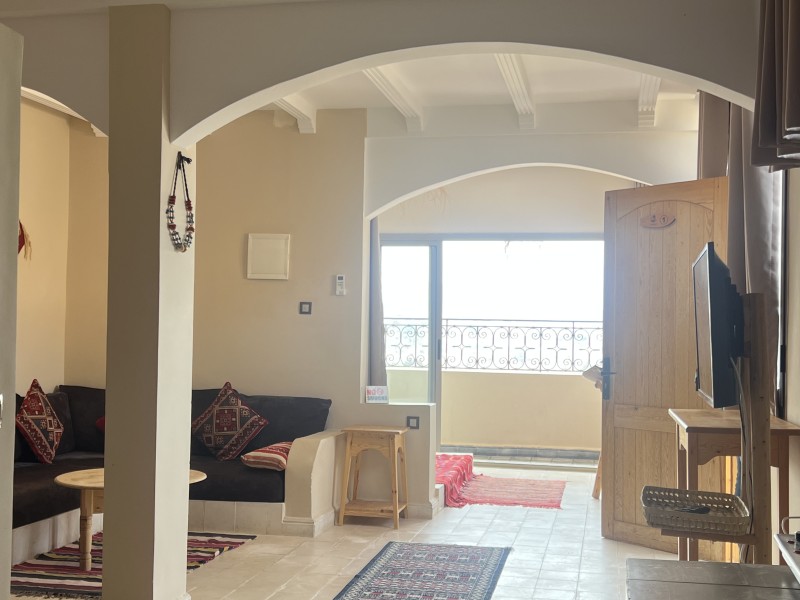 A spacious Moroccan-style apartment with authentic charm, large windows and a private balcony overlooking breathtaking ocean views. It features a double bed, salon with sofa & TV, fully equipped kitchen, small fridge, private bathroom with shower . Enjoy modern comfort with high-speed Wi-Fi and a work desk, perfect for remote work. Ideal for couples, families, and surfers. Breakfast (included in the price) is served on the rooftop terrace, the perfect spot to start your day with a beautiful ocean view.