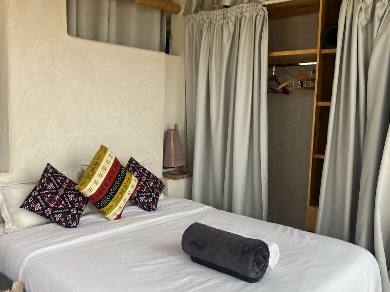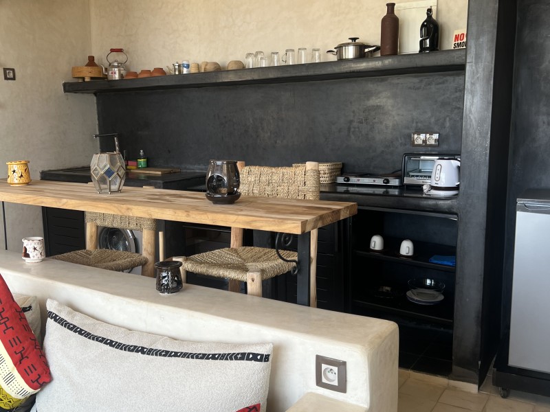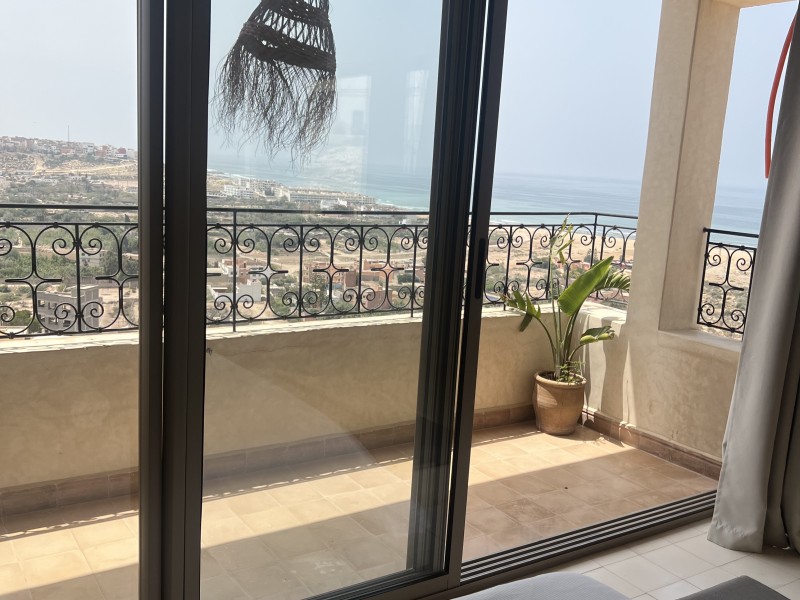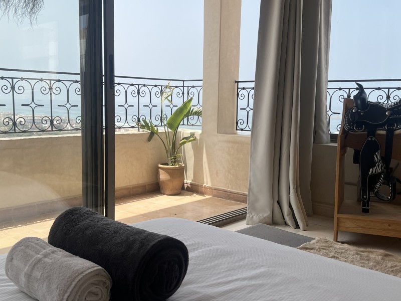 Queen suite with sea view and Balcony is a Spacious Moroccan-style apartment 55 m2 with stunning ocean view, private balcony, and modern comforts. Features a comfortable double bed, a cozy sitting area with a sofa & TV, fully equipped kitchen, washing machine. private bathroom with bathtub, and high-speed Wi-Fi with work desk – perfect for remote work, Ideal place to enjoy your vacation while working remotely. Breakfast (included in the price) is served on the rooftop terrace, the perfect spot to start your day with a beautiful ocean view.