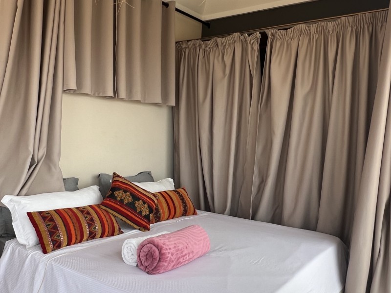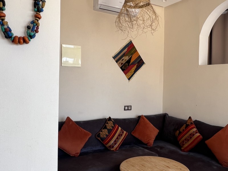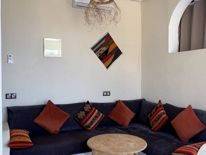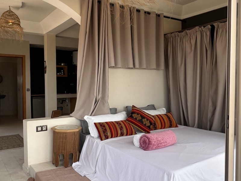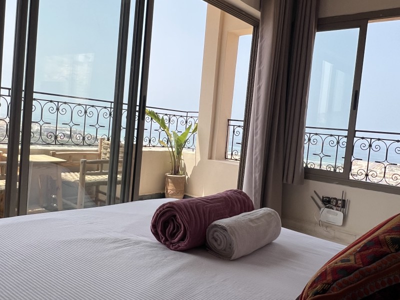 Sunset Suite with Ocean views, balcony, a Spacious 55m² Moroccan-style apartment, featuring large windows and a balcony with panoramic ocean view. Includes a double bed, cozy salon, TV, kitchen, fridge, private bathroom with shower, Speed Wi-Fi, and coworking space ideal for remote working. Perfect for surfers, couples, or families. Breakfast included on the panoramic rooftop with stunning beach views.