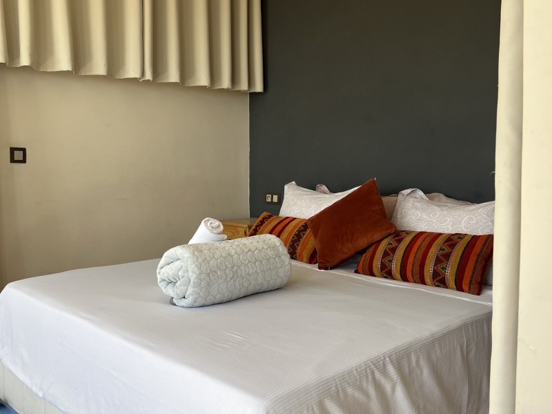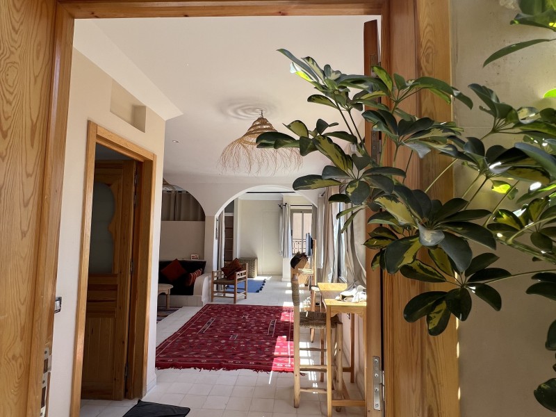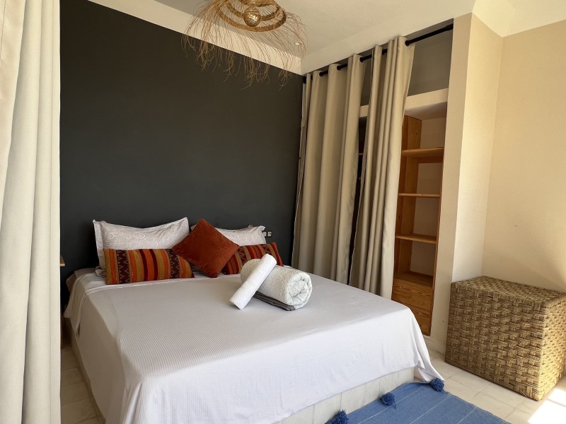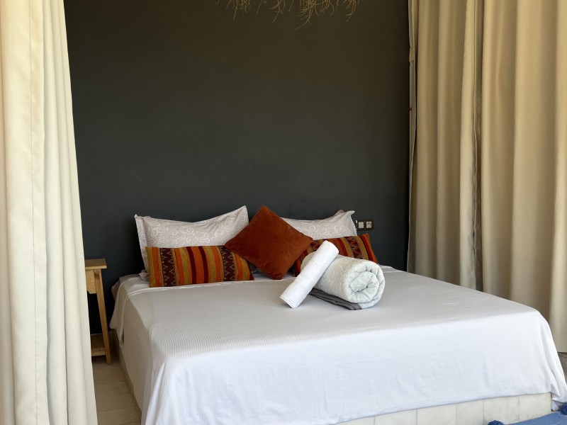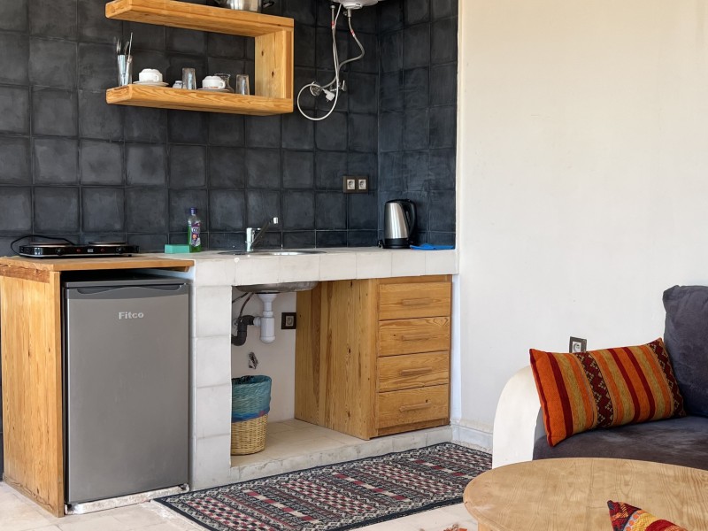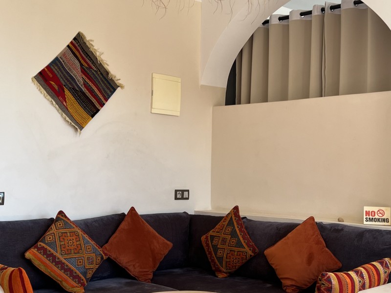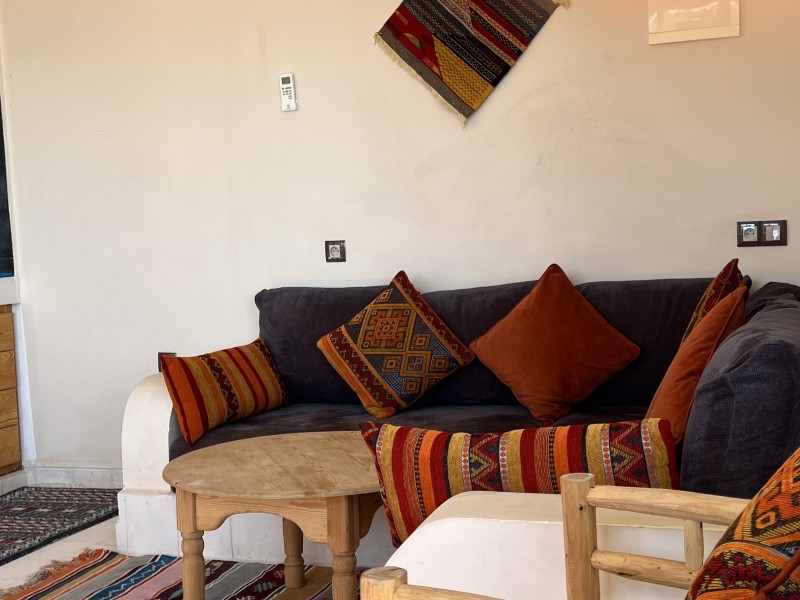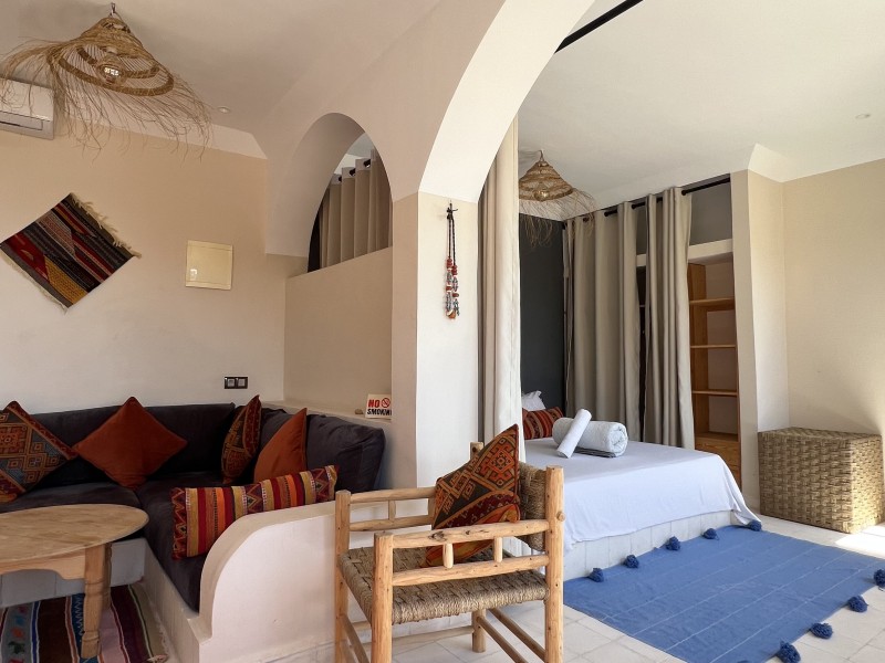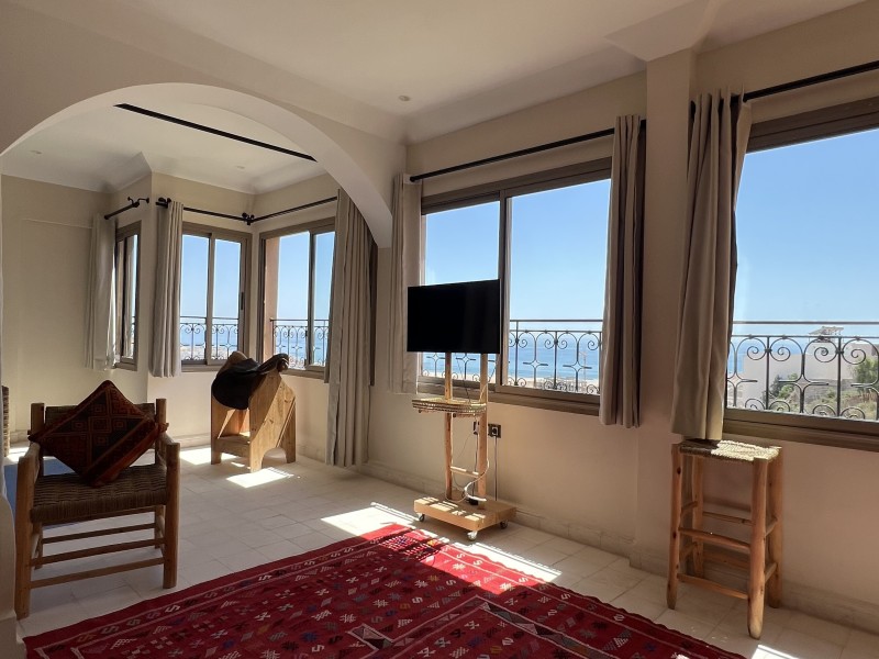 King suite with sea view is a bright apartment combines authentic Moroccan style with modern comfort. Large windows open to breathtaking views of the ocean , the perfect spot for your morning coffee or sunset relaxation. Inside: -A cozy double bed -A stylish salon with sofa & TV -A fully equipped kitchen with fridge -Private bathroom with shower -Free High-speed Wi-Fi Perfect for both vacations and remote work. Breakfast is served on the rooftop terrace, the perfect spot to start your day with a beautiful ocean view.