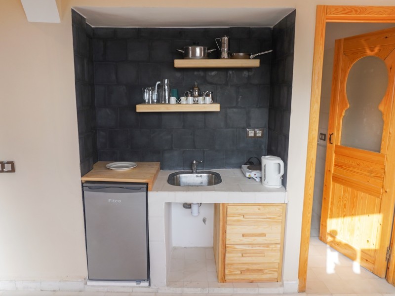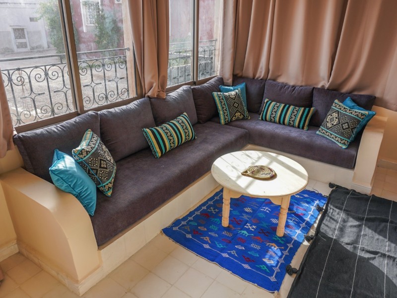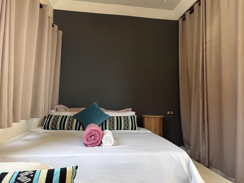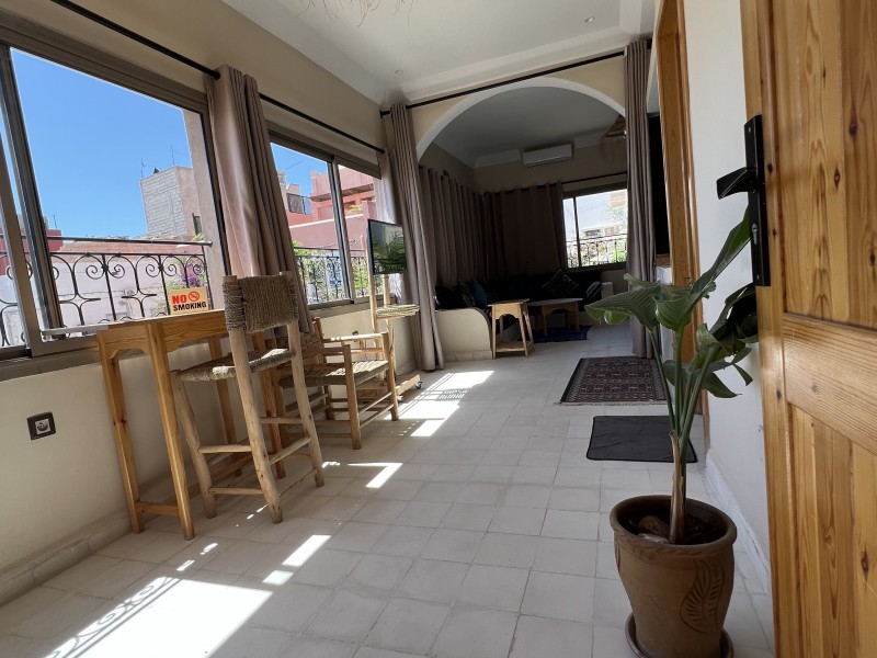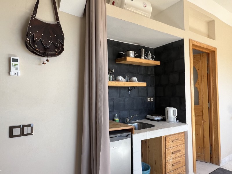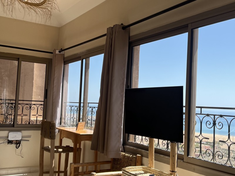 A Sunset and Spacious 55m2 Moroccan-style apartment with large windows and a stunning ocean view. It includes a double bed, cozy salon with sofa and TV, fully equipped kitchen, private bathroom, fridge, Speed Wi-Fi, and a work desk — perfect for remote working or a coworking space. Just 15 minutes’ walk from Banana Beach, ideal for surf lovers, couples, and families. Breakfast included on the panoramic rooftop terrace, the perfect place to start your day with relaxing beach and ocean views.