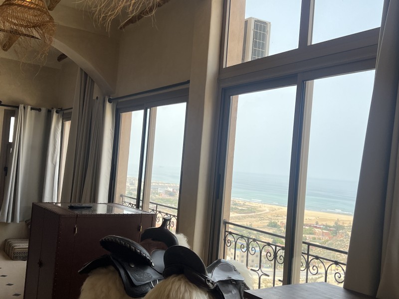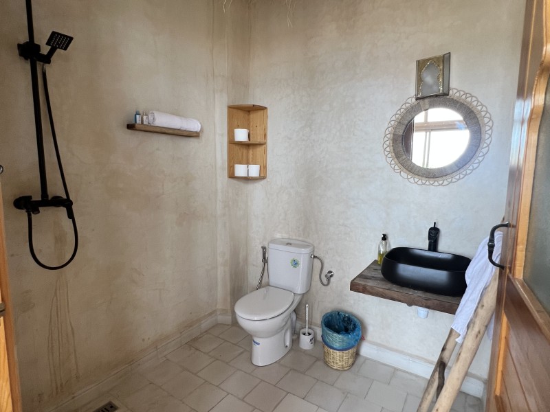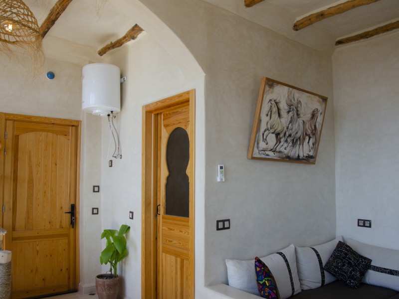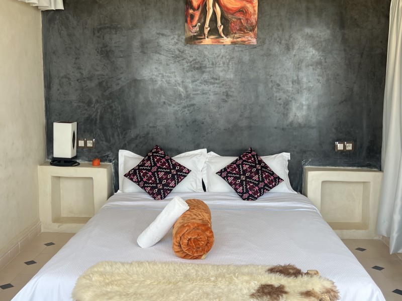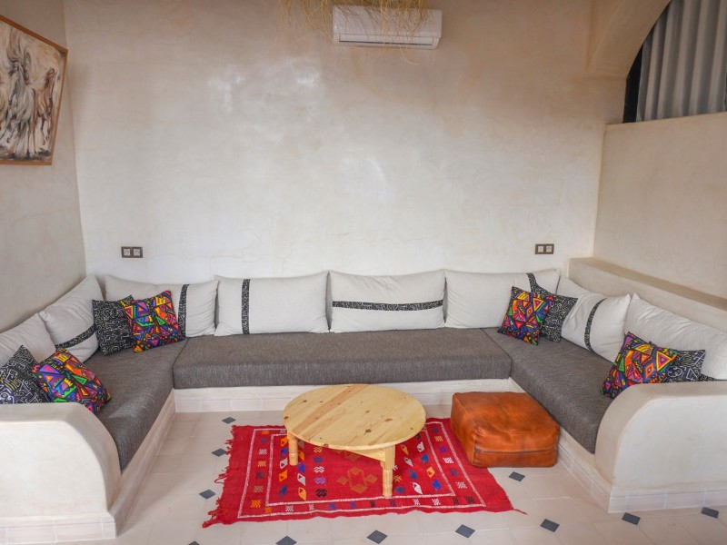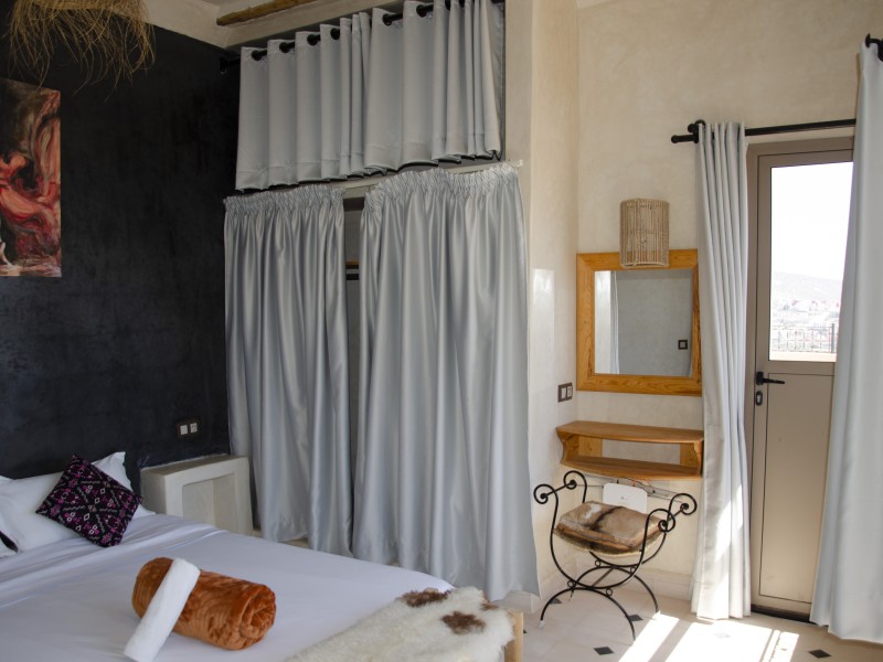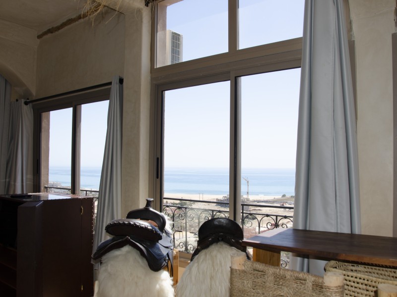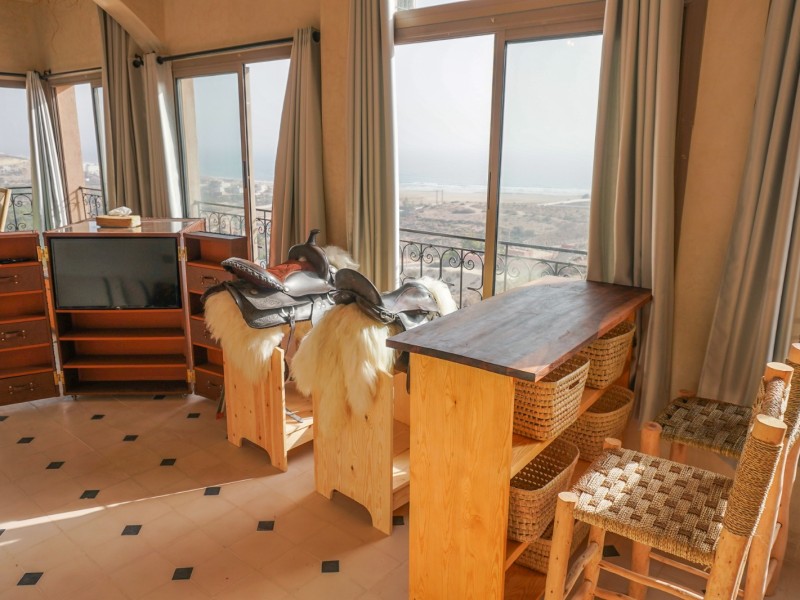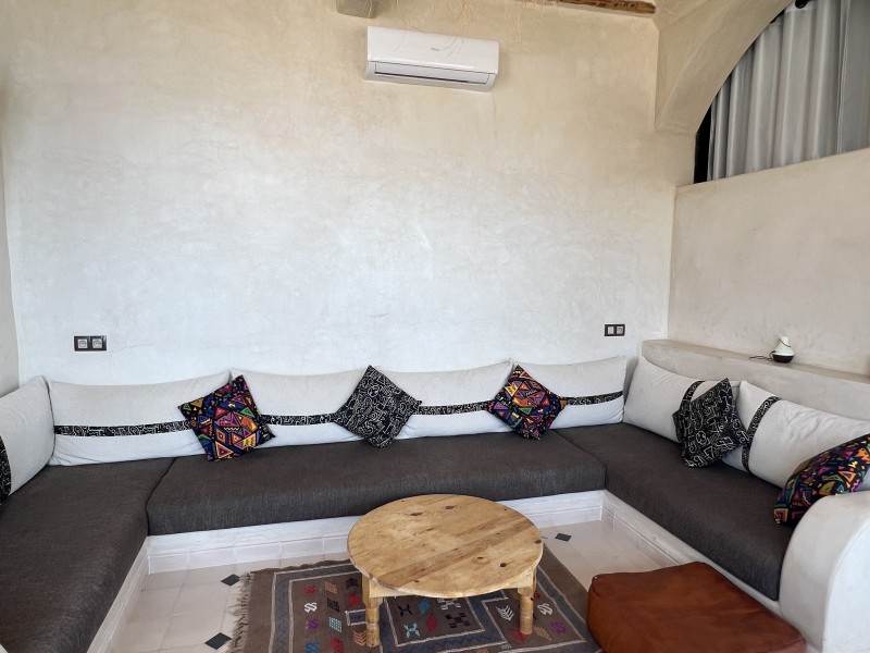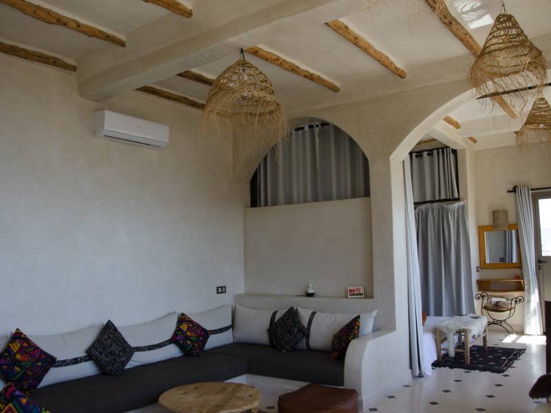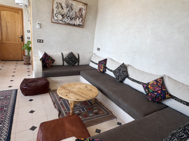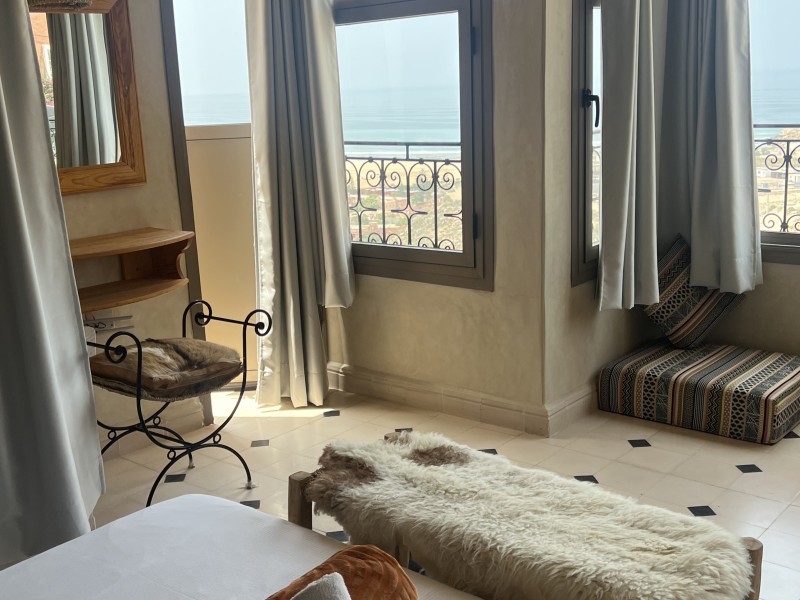 Superior suite with sea view a spacious 55m² Moroccan-style apartment with large windows and a spacious terasse offering a beautiful ocean view. It features a double bed, salon with large sofa, TV, fully equipped kitchen, private bathroom with shower, good Wi-Fi high speed, a work desk, and a small fridge. Perfect for couples, families, and surfers, ideal place to enjoy your vacation while working remotely. Breakfast is served on the rooftop terrace, the perfect spot to start your day with a beautiful ocean view.
